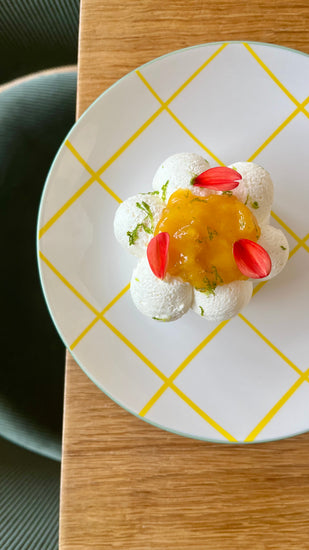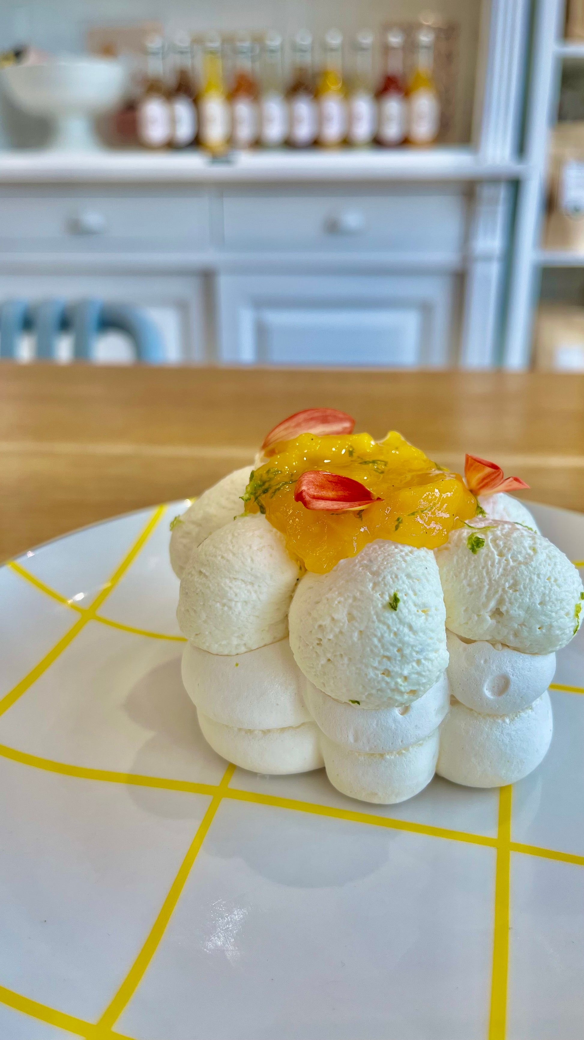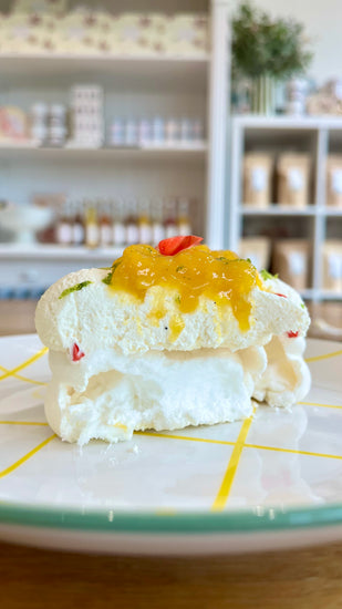 Meringue fondante, crème fouettée à la vanille, compotée de mangue et citron vert.