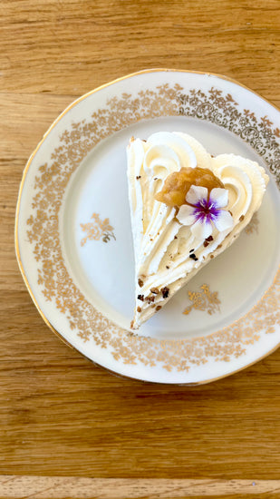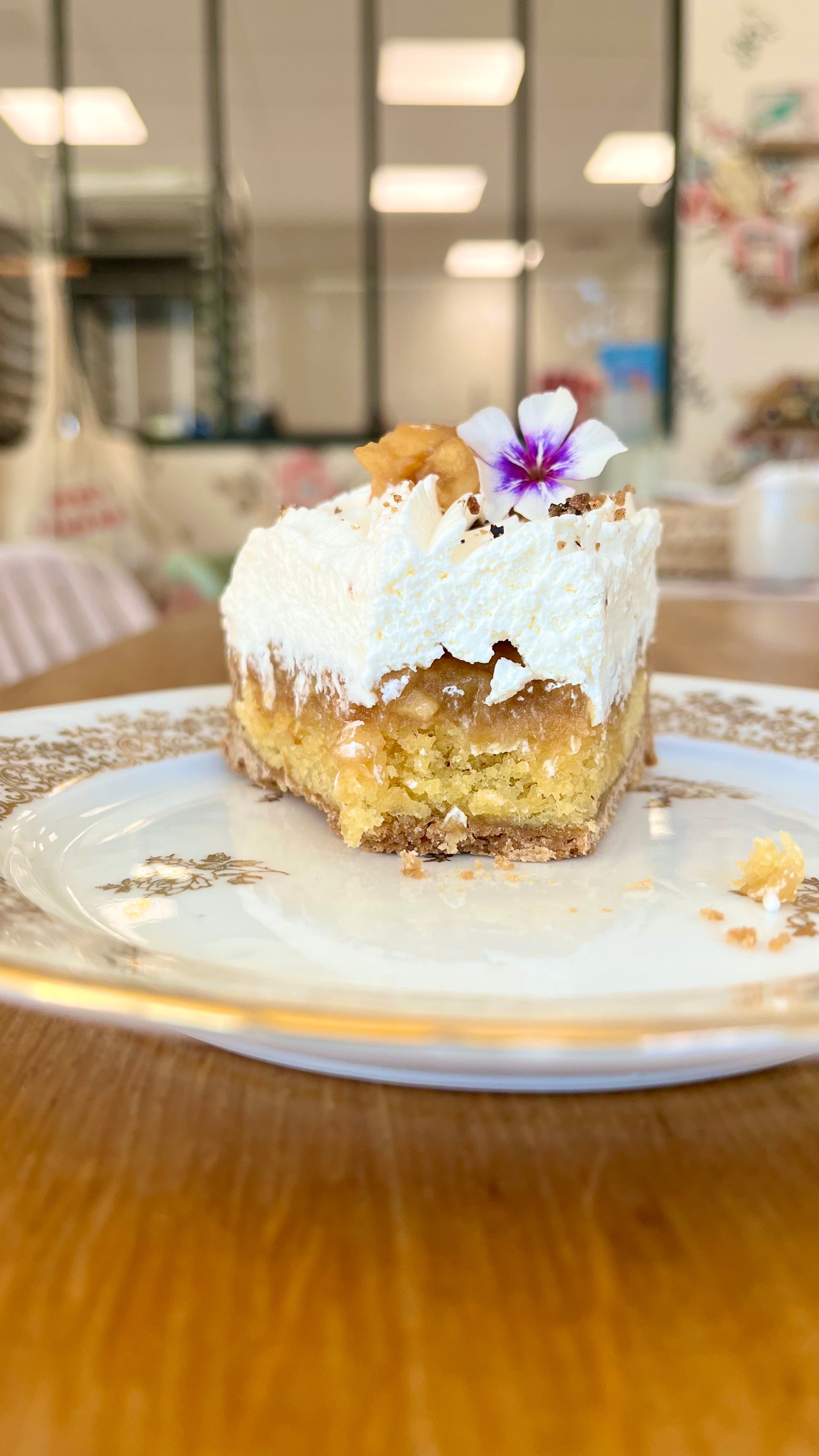 Base de pâte sablée, fondant aux amandes, compotée de pommes et crème fouettée à la fève de tonka.