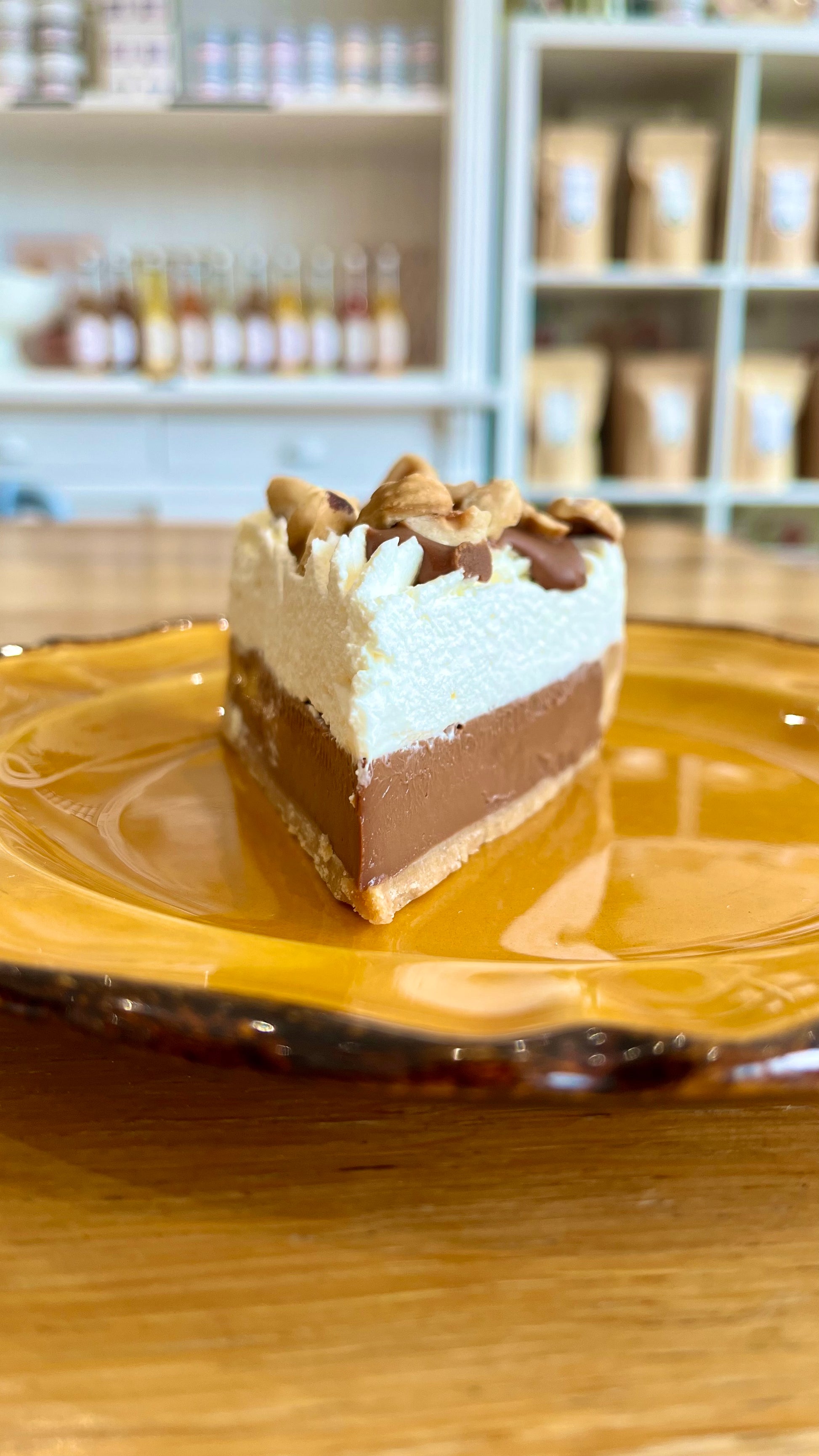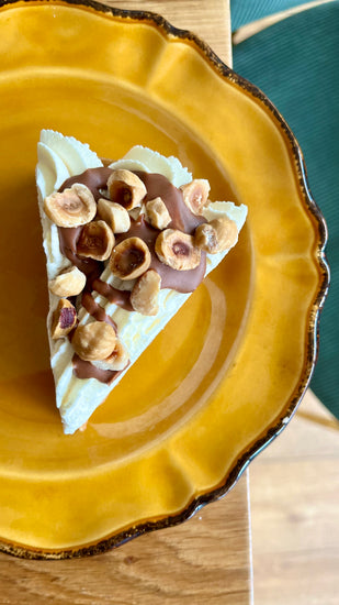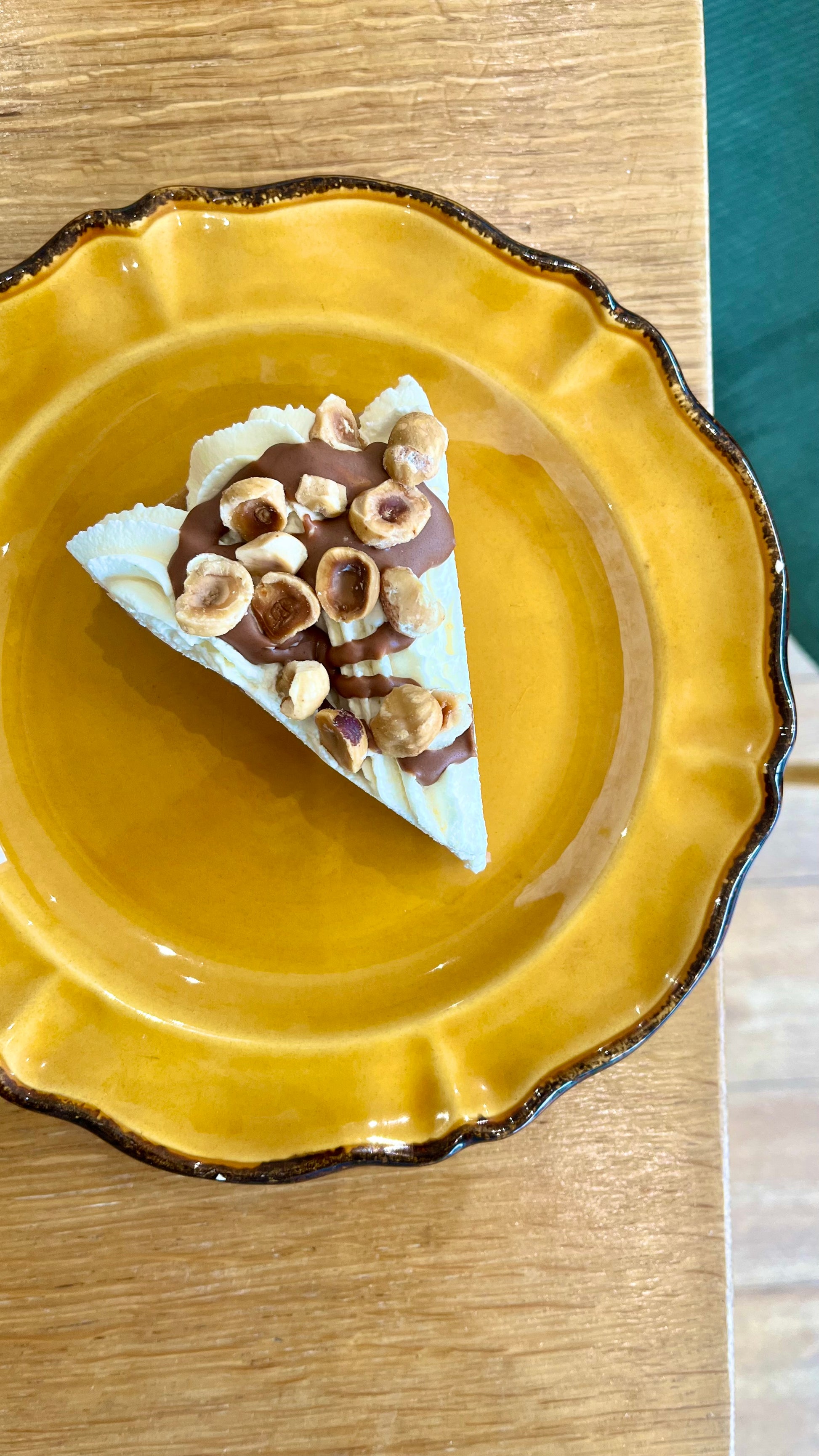 Base de pâte sablée, crémeux aux chocolats et noisettes, crème fouettée vanillée, gianduja et noisettes torréfiées.