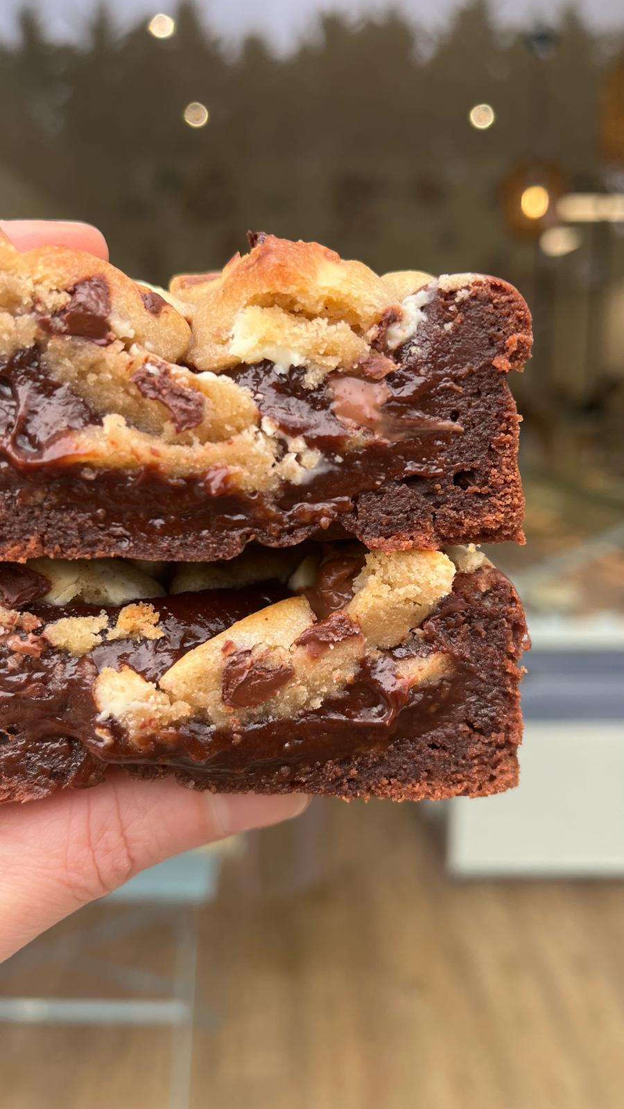 Brookie : brownie très fondant au chocolat noir et noix de pécan, recouvert de morceaux de cookies aux pépites de chocolat.